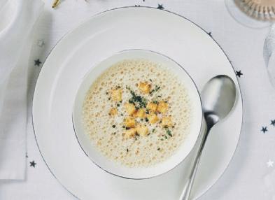 4. Tillsätt mjölken och mixa så att soppan får ett fint skum vid servering. Toppa med krutonger och gräslök.