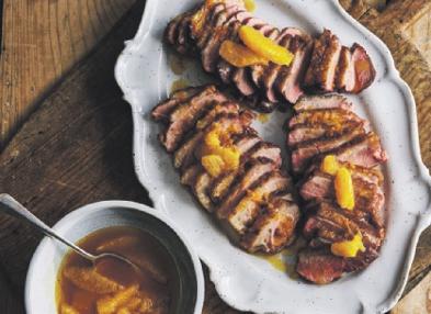 6.Skiva upp ankan och lägg på ett fat. Häll över såsen och servera direkt.