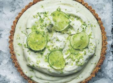 7. Vispa grädden flu g. Toppa pajen med grädde, limeskal och limeskivor.