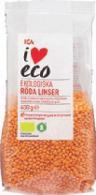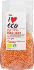 Röda linser ICA i love eco. 400 g. Jfr pris 50:00/kg.