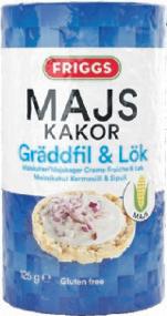 Smaksatta riskakor, majskakor Friggs. 120-130 g. Jfr pris 128:21-138:89/kg. Max 1 köp/hushåll.