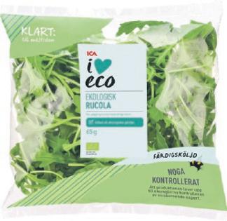 Ekologiska sallater i påse ICA I love eco. 65 g. Jfr pris 230:77/kg.