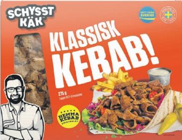 Kebab Schysst käk. 275-350 g. Gäller ej Dönerkebab. 121:43-154:55/kg. Max 1 köp/hushåll.