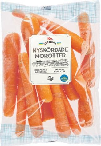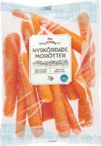Nyskördade morötter i påse ICA. Sverige. 1 kg. Klass 1. Jfr pris 10:00/kg.