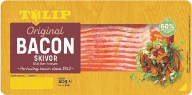 Tulip. 100-125 g. Gäller även kalkon-, och kycklingbacon. Jfr pris 100:00-125:00/kg.