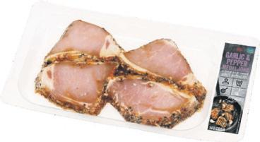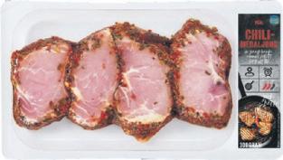 Kryddade fläskmedaljonger ICA. Ursprung Sverige. 300 g. Chili. Garlic/pepper. Av benfri kotlett. Jfr pris 133:33/kg.
