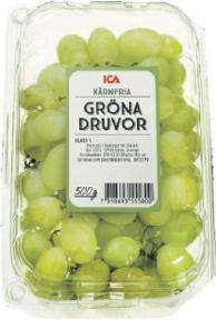 Gröna kärnfria druvor i ask ICA. Indien. 500 g. Klass 1. Jfr pris 50:00/kg.