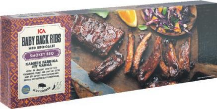 Baby back ribs ICA. Ursprung Sverige. 475 g. Slow cooked. Med glaze. Jfr pris 117:89/kg.