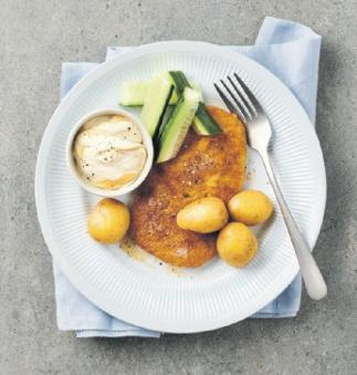 Färsk panerad schnitzel ICA. Ursprung Sverige. 300 g. Av benfri kotlett. Jfr pris 140:00/kg.