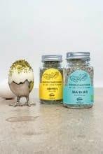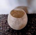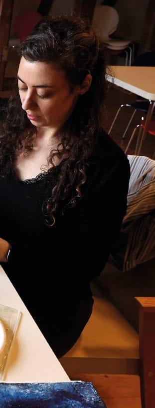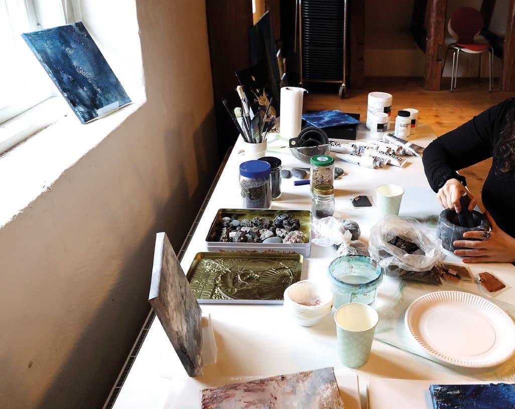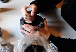 Rebecca Dömling skapar egna färger, genom att blanda i naturmaterial. Här mortlar hon kol från en väns eldstad, som ska blandas med andra naturmaterial och akrylfärg.