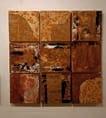 Hennes abstrakta verk, med sina skrovliga ytor, består bokstavligt talat av små, små bitar av naturen. Mycket av det från Österlen.
