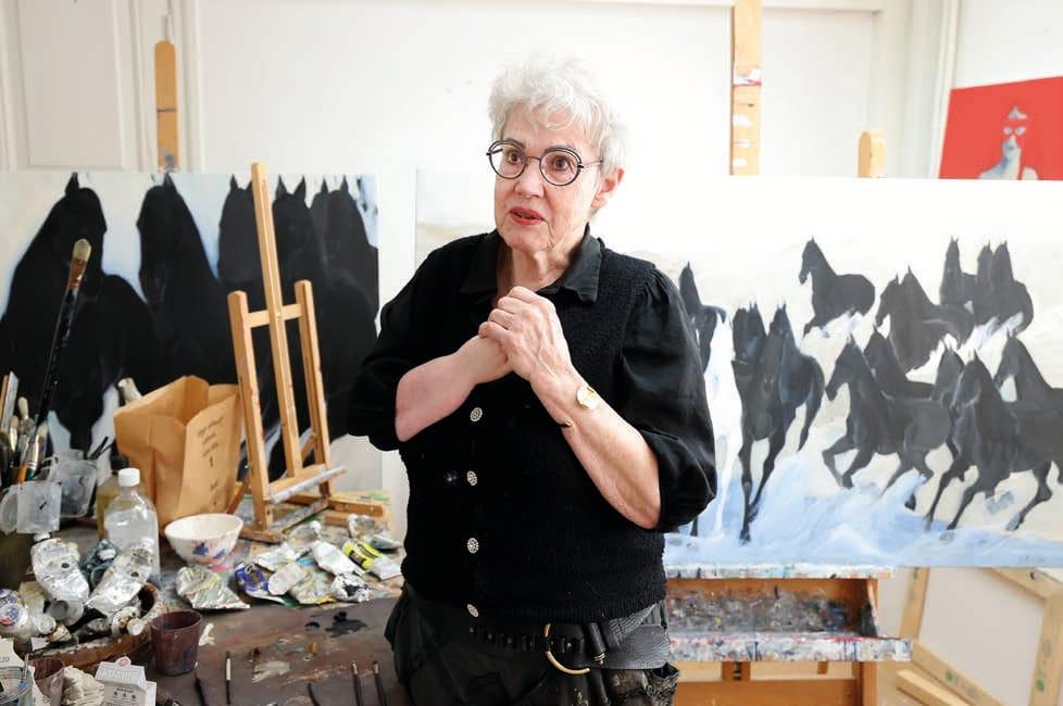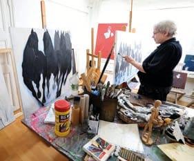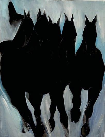 ännu ett verk med hästar på. Det hon vill fånga är rörelserna och muskelspelet. Hon minns en köpare för några år sedan som tyckte hon lyckats väl med det. – Han köpte nästan alla tavlorna i