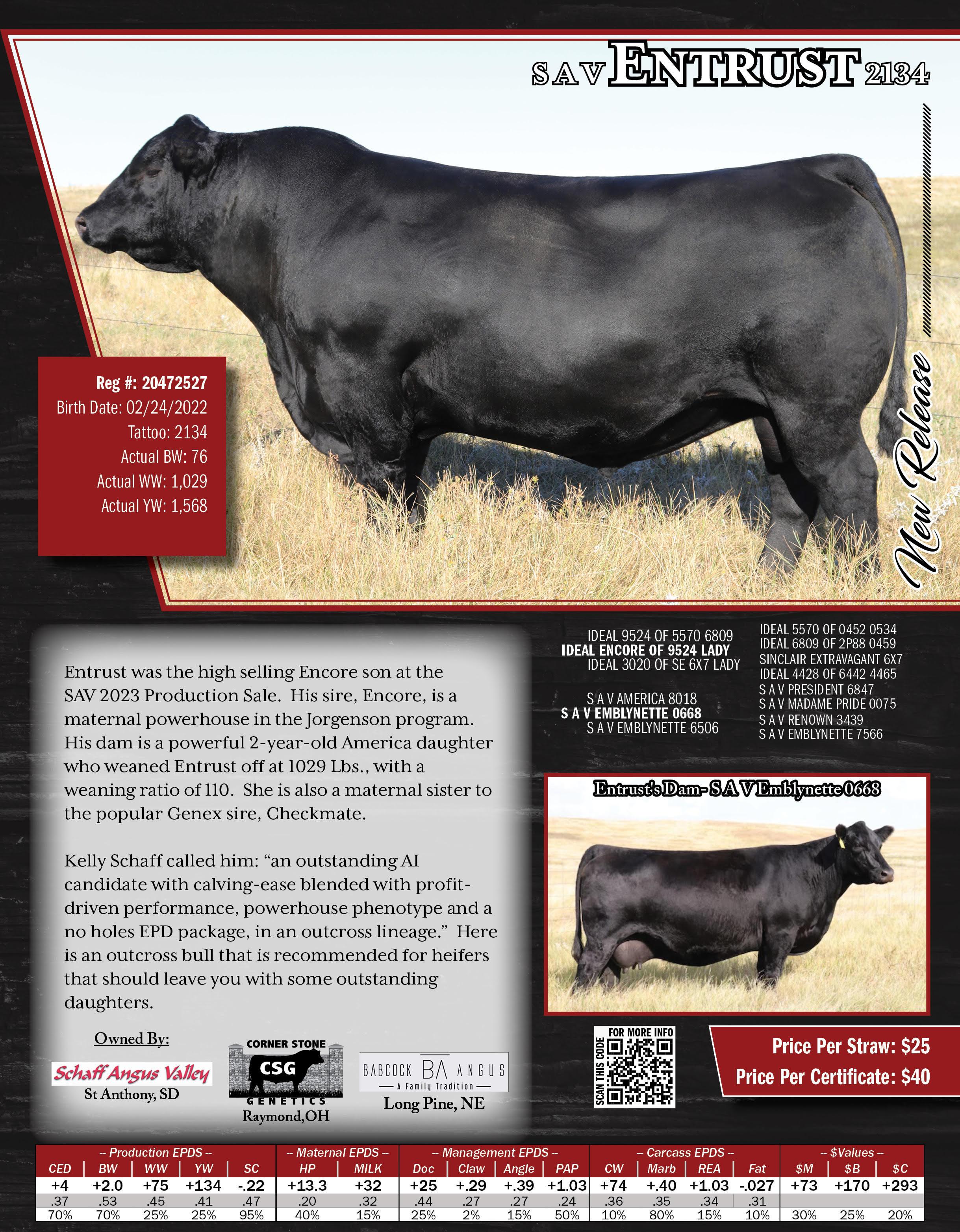 • One of our first Bulls to offer for Sale out of the $40,000 herd Bull SAV Entrust 2134. This bull shows the length of spine and thickness of his sire along with eye appealing package. This calf keeps getting better everyday, and could rival the whole line up for sheer power at sale Day. His Grandam SAV Emblynette 5326 was the mother of the top Selling bull of the 2025 sale, Corner Stone Catalyst 10R who sold for $30,000 to Babcock Angus Longpine NE, and Scioto Valley Angus, McArther OH