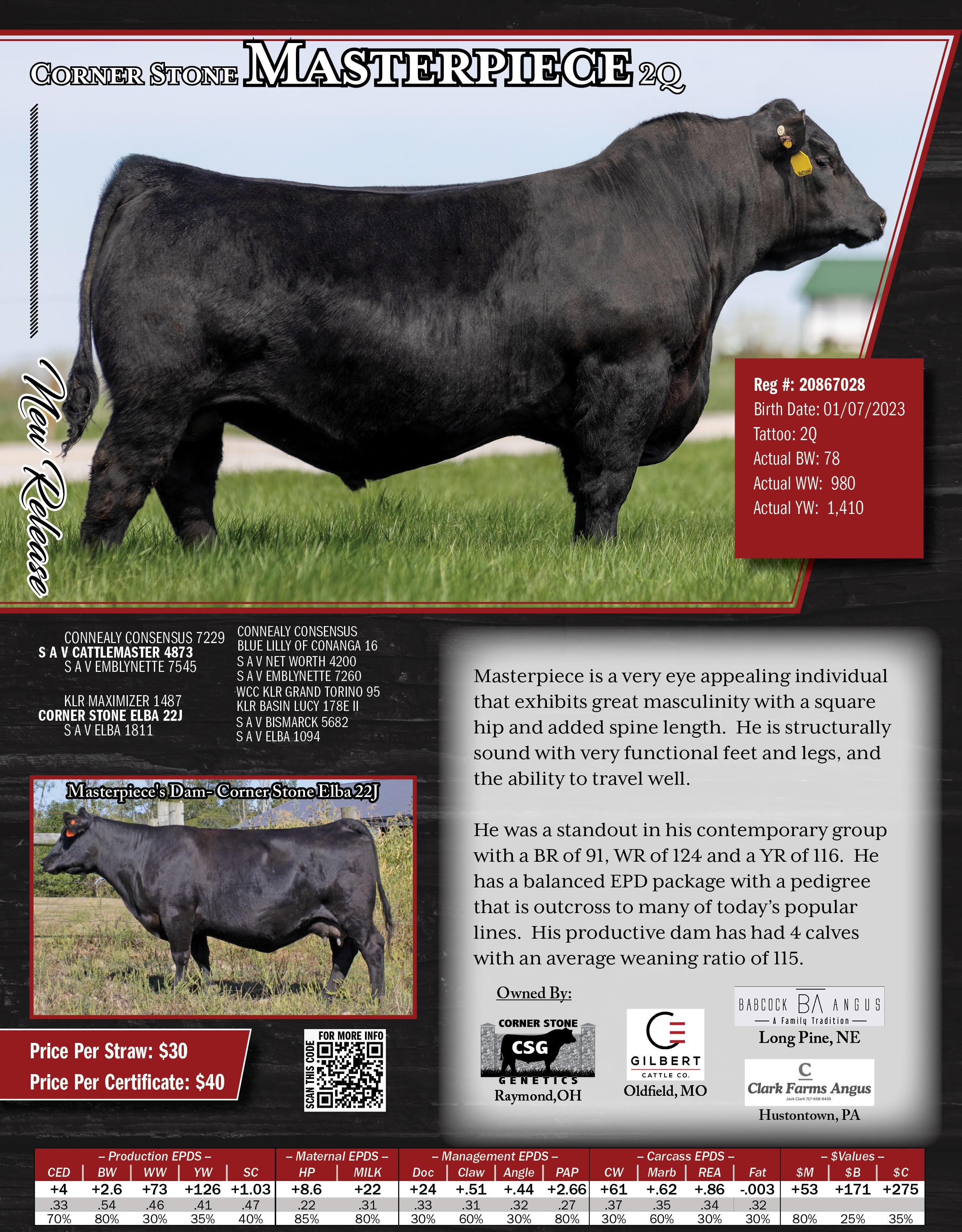 • One of the Youngest Bulls in the offering and natural son of 22J, from our herd Sire Forecast. He has one of the most impressive BW to YW EPD profiles of the sale, his dam 22J produced 3 straight high selling bulls and heifers over the last 3 years. We decided to flush her which set her back in her cycle. Wanting to make sure we didn’t completely take her out of her spring calving, we naturally bred her, and she never disappoints. No matter what AI Sire is used, she is going to add pounds in fantastic eye appealing, great footed, and performance package, and 76S is no different. His ADJ WW and ADJ YW puts him at the heaviest bulls in the sale offering. His maternal brothers have led of the 2023 & 2024 Corner Stone Bull and high seller’s. Corner Stone Masterpiece 2Q was the $35,000 ½ interest Lot 1 Bull, purchased by Babcock Angus, Gilbert Farm MO, and Clark Farms PA, and now leased to Breeder Link. Corner Stone Elba 22J is apart of one of the greatest flushes at Corner Stone combining the former #1 performance EPD sire for WW & YW in the entire breed KLR Maxmizer 1487, to the Legendary daughter of SAV Elba 1094, SAV Elba 1811. The prolific flush lead to the High WDA Jackpot winner at the Treasure Bull test in 2018 and many other stand out sons and daughters including the top selling bull from our 2019 bull Sale Optimizer 8005, who is currently leased to Sire Buyer.