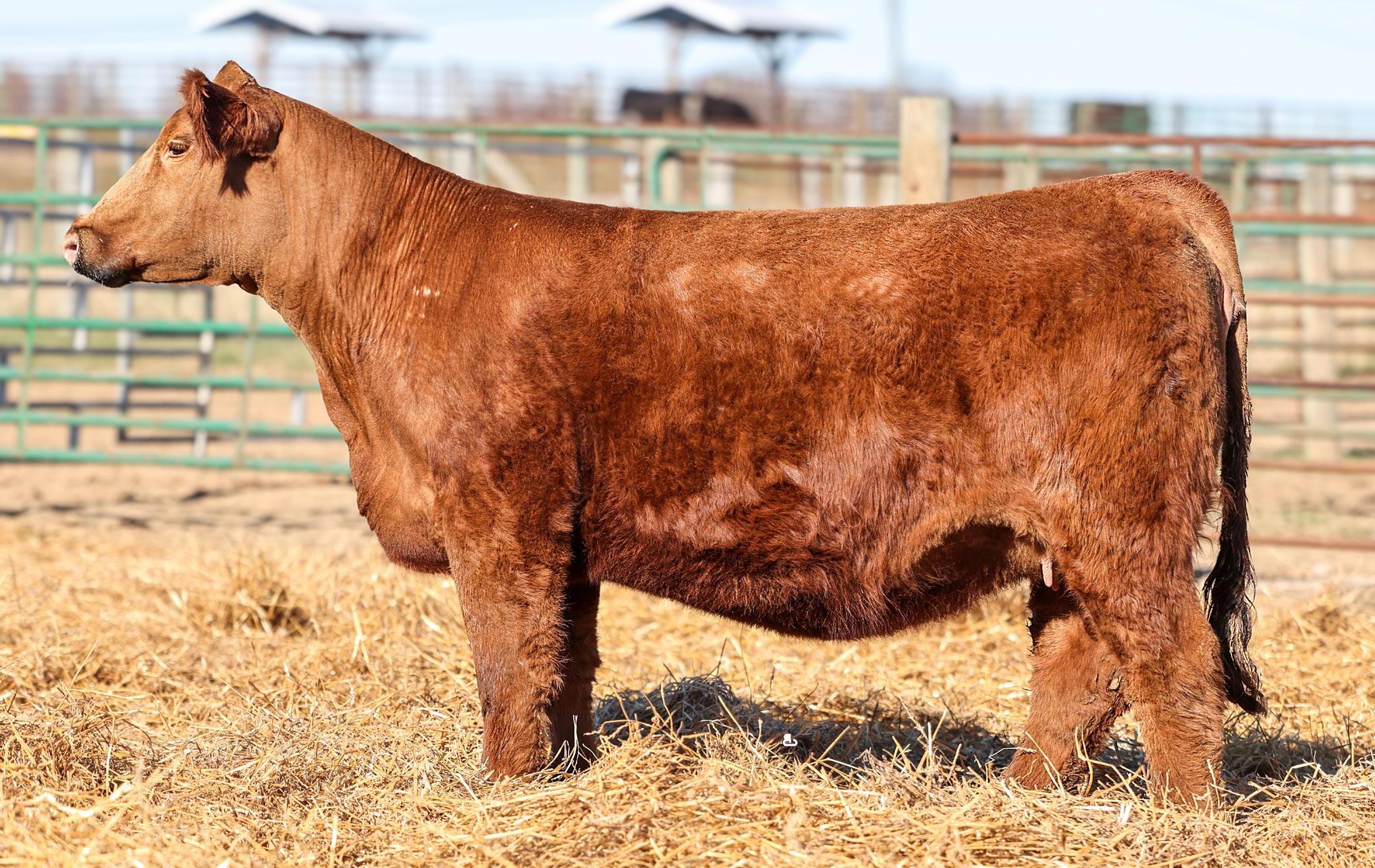 Red-headed beauty! This direct daughter of 933E has done all we could ask for as a first calf heifer. Gorgeous to look at, sound structured, and laid down to have an AI-sired sold red heifer calf coupon at her side. Invest with confidence, this one is hard to let go. Sells with a heifer calf at side, born 1/3/26, sired by GCC Night Owl 3104L (ASA# 4284092), .