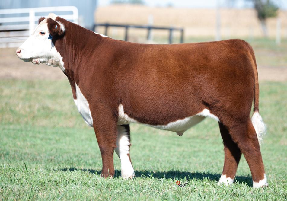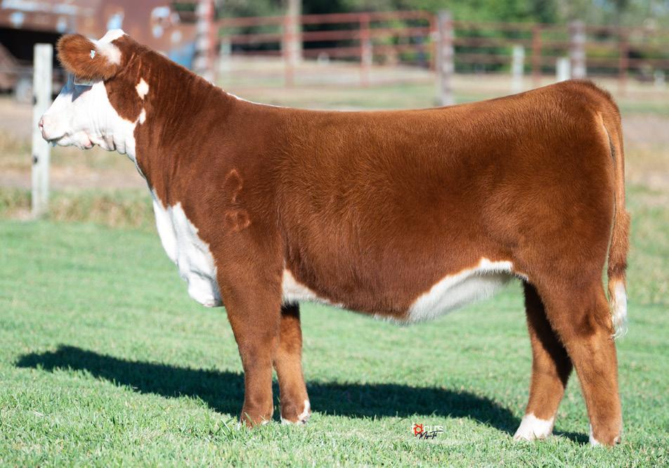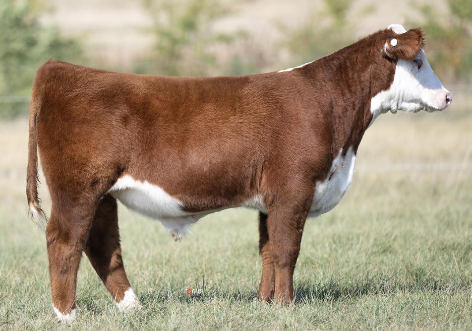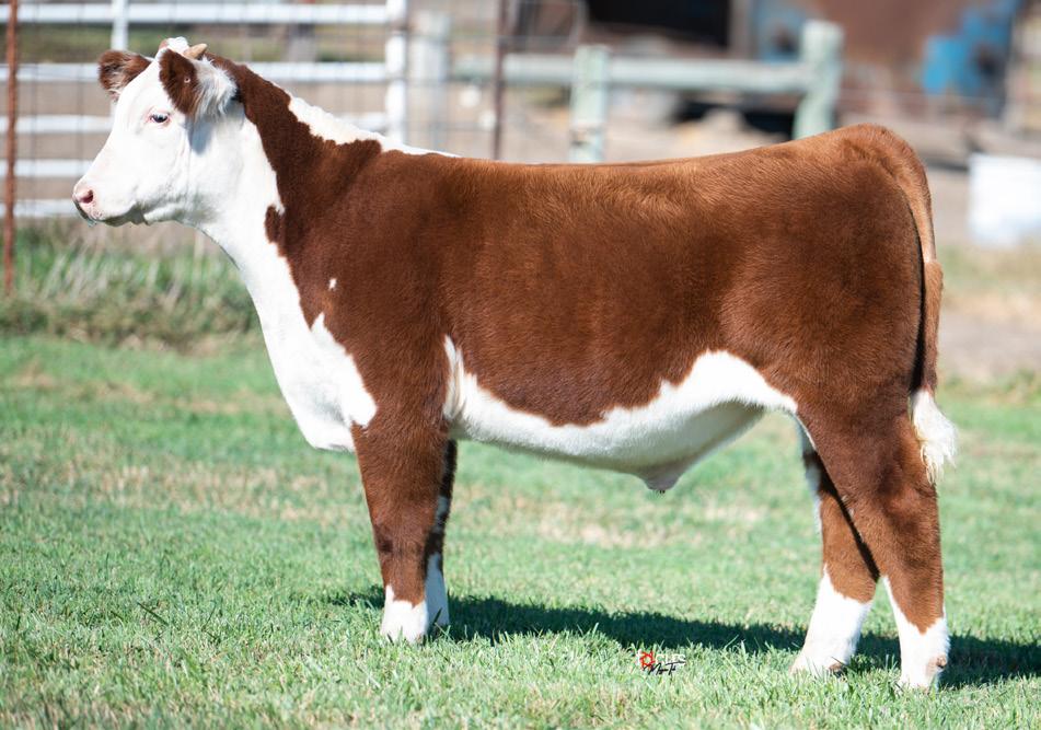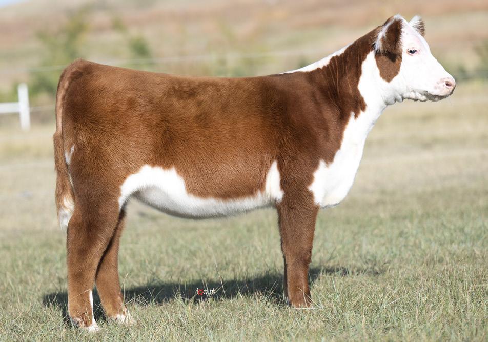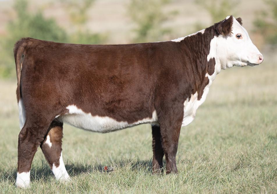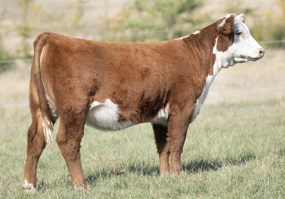 Maternal Sib to the 2024 Champion Horned Hereford Heifer at the Iowa State Fair. Very complete, dark pigment, polled heifer on an awesome set of feet and legs.