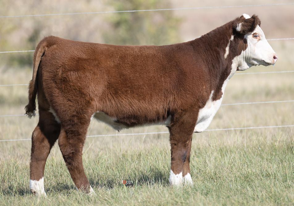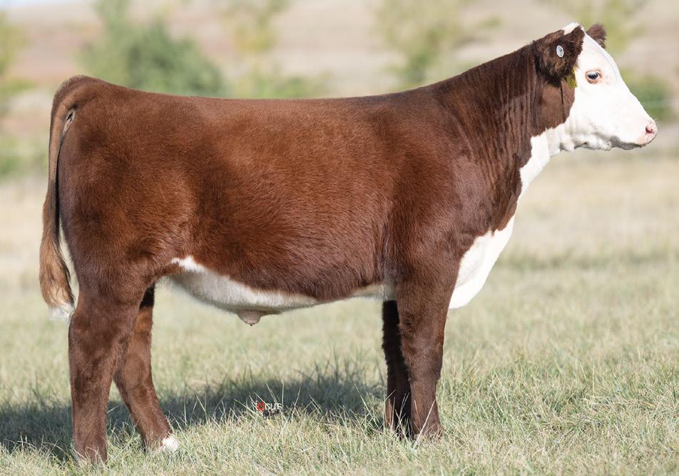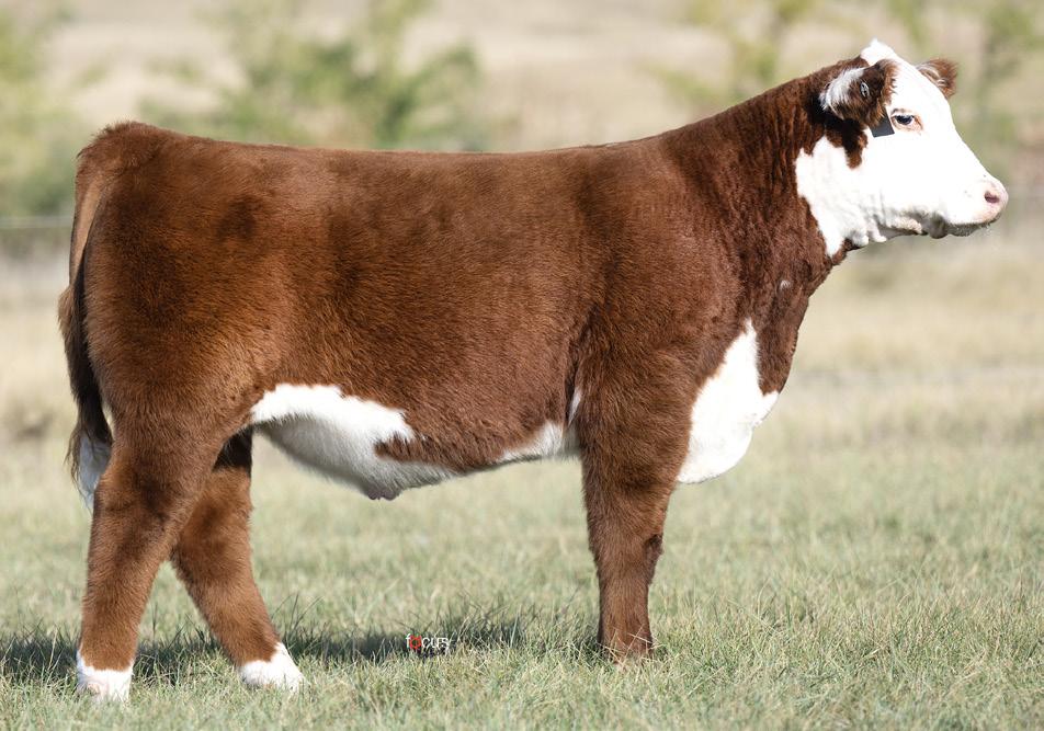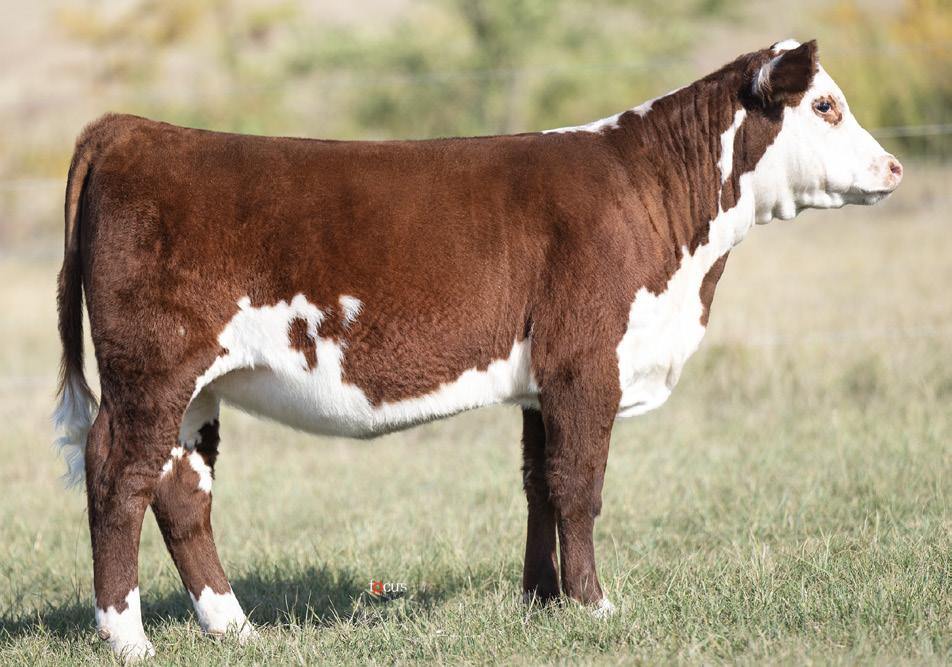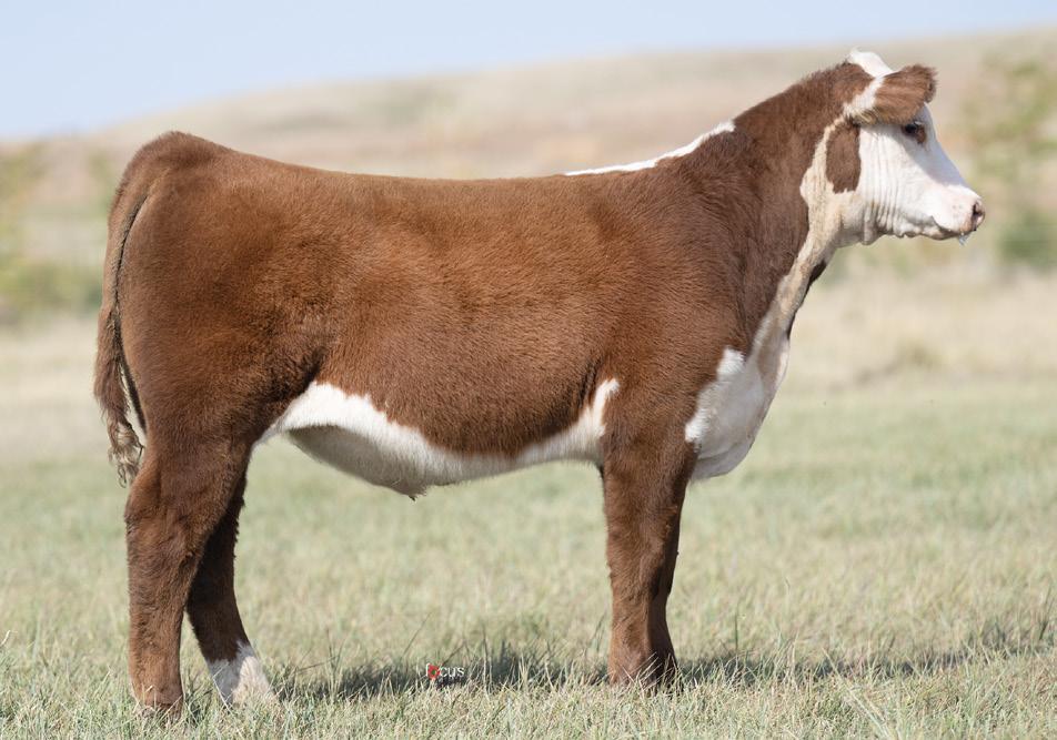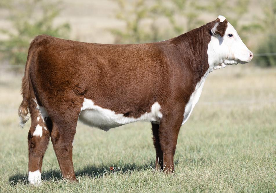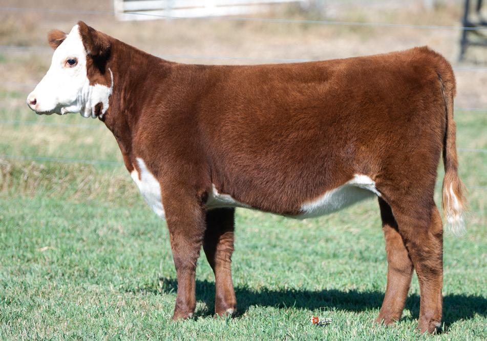 Maternal Sib to the 2024 Champion Horned Hereford Heifer at the Iowa State Fair. Very complete, dark pigment, polled heifer on an awesome set of feet and legs.