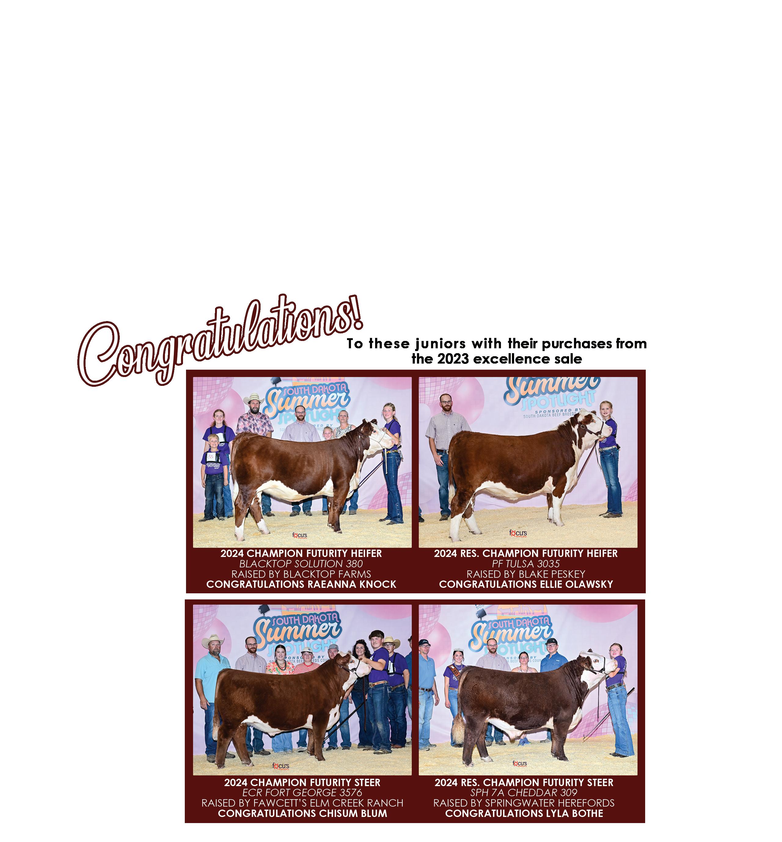 The SDHA will present $600 grants to selected youth who apply and are selected for the grants. These grants may be used toward the purchase of a heifer in the 2024 Excellence Sale or the 2025 Watertown Winter Farm Show. Applications are available online at www.southdakotaherefords.org/juniors/ under forms.