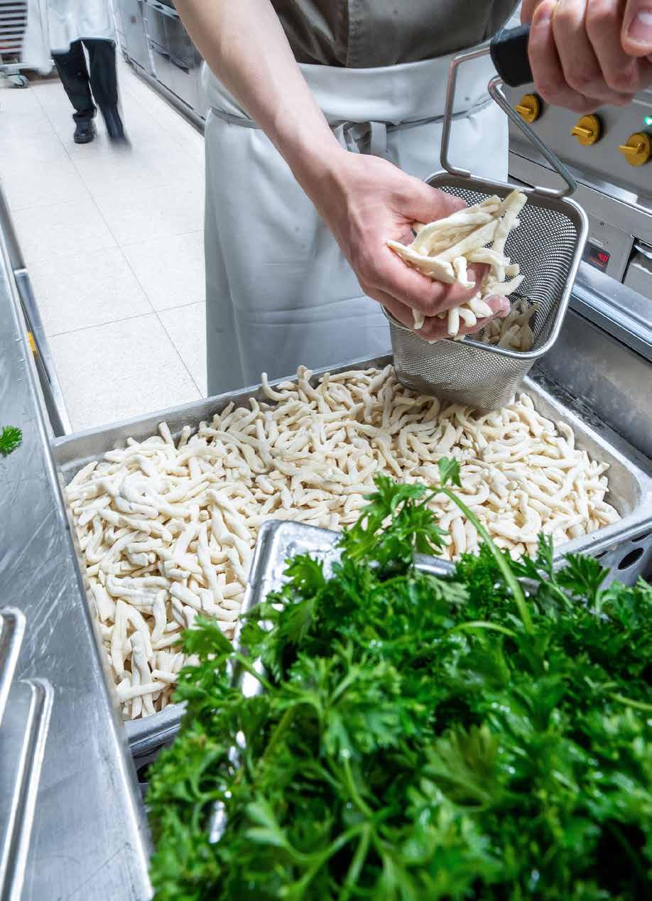 Tomás Fleischmann: Gastronominnen und Gastronomen stehen täglich vor der Herausforderung, ein einzigartiges, gesundes und leckeres Essen zu kreieren. Mit unseren Ölen und Fetten haben sie einen verlässlichen Partner an ihrer Seite. Während Belfina für hochwertige Speisefette steht, werden unter dem Markennamen Nutriswiss traditionelle Öle vertrieben. Für jedes Bedürfnis, jeden Geschmack und jede Anwendung gibt es das passende Produkt. Zum Belfina Sortiment gehören verschiedene Bratcrèmen mit und ohne Butter, Margarinen sowie Schweineund Rinderfette. Besonders beliebt ist unsere Belfina Classic Bratcrème. Wir legen aber auch grossen Wert auf Regionalität und Swissness: Ganz aktuell und traditionell ist beispielsweise unser Belfina Bratöl mit Appenzeller Bergbutter, das – wie es der Name sagt – mit frischer Bergbutter verfeinert wird. Abgerundet wird unser Sortiment mit den NutriswissÖlen. Diese bestehen aus Sonnenblumenöl, High Oleic Sonnenblumenöl, Raps- und Erdnussöl. Aber auch Schweizer Holl Raps bieten wir an: Es ist ein gesundes und hochwertiges Speiseöl mit einem hohen Anteil an reichhaltigen, ungesättigten Fettsäuren. Gerne berate ich unsere Kunden vor Ort zu den gewünschten Produkten.