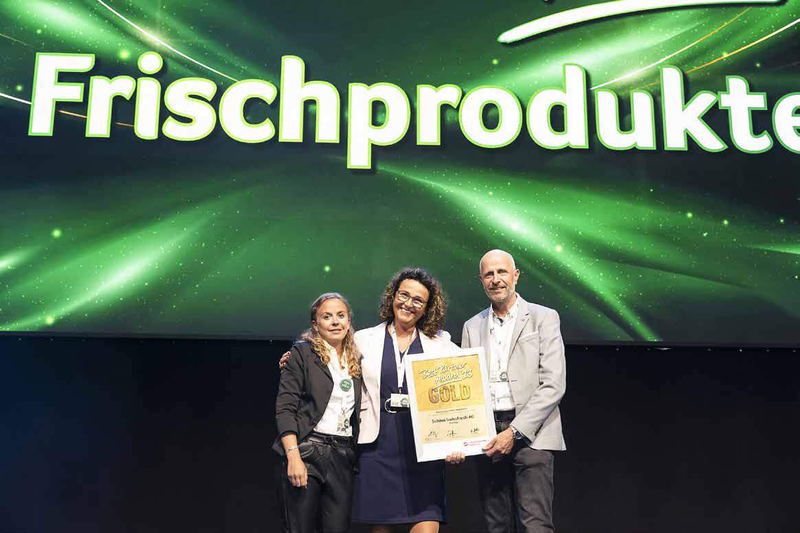 Valérie Hofer et Laurent Bersier de Transgourmet/ Prodega ont remis à Andrea Schöni de Schöni Swissfresh AG (au centre), un diplôme d‘or dans la catégorie produits frais.
