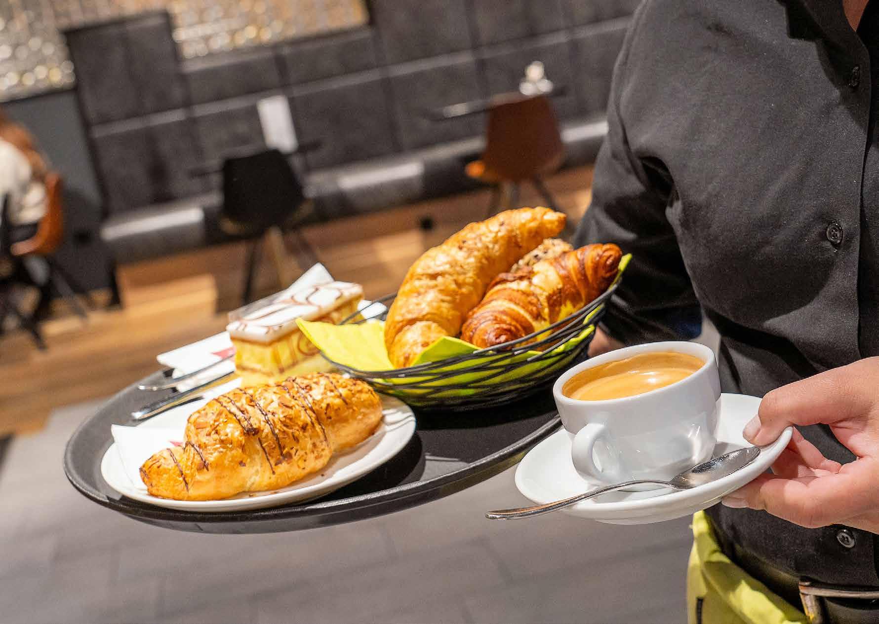 morgens Frühstück für Hotelgäste serviert und nachmittags und abends kleine Snacks von der Bar geben.