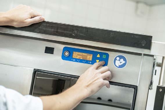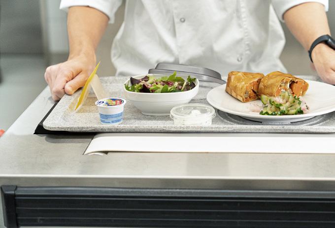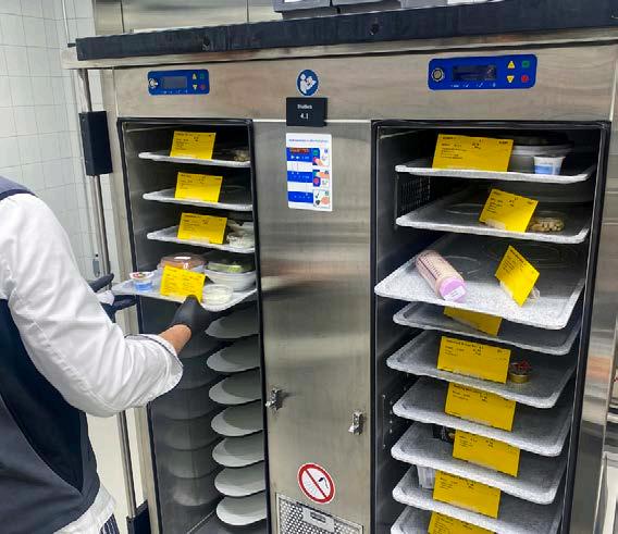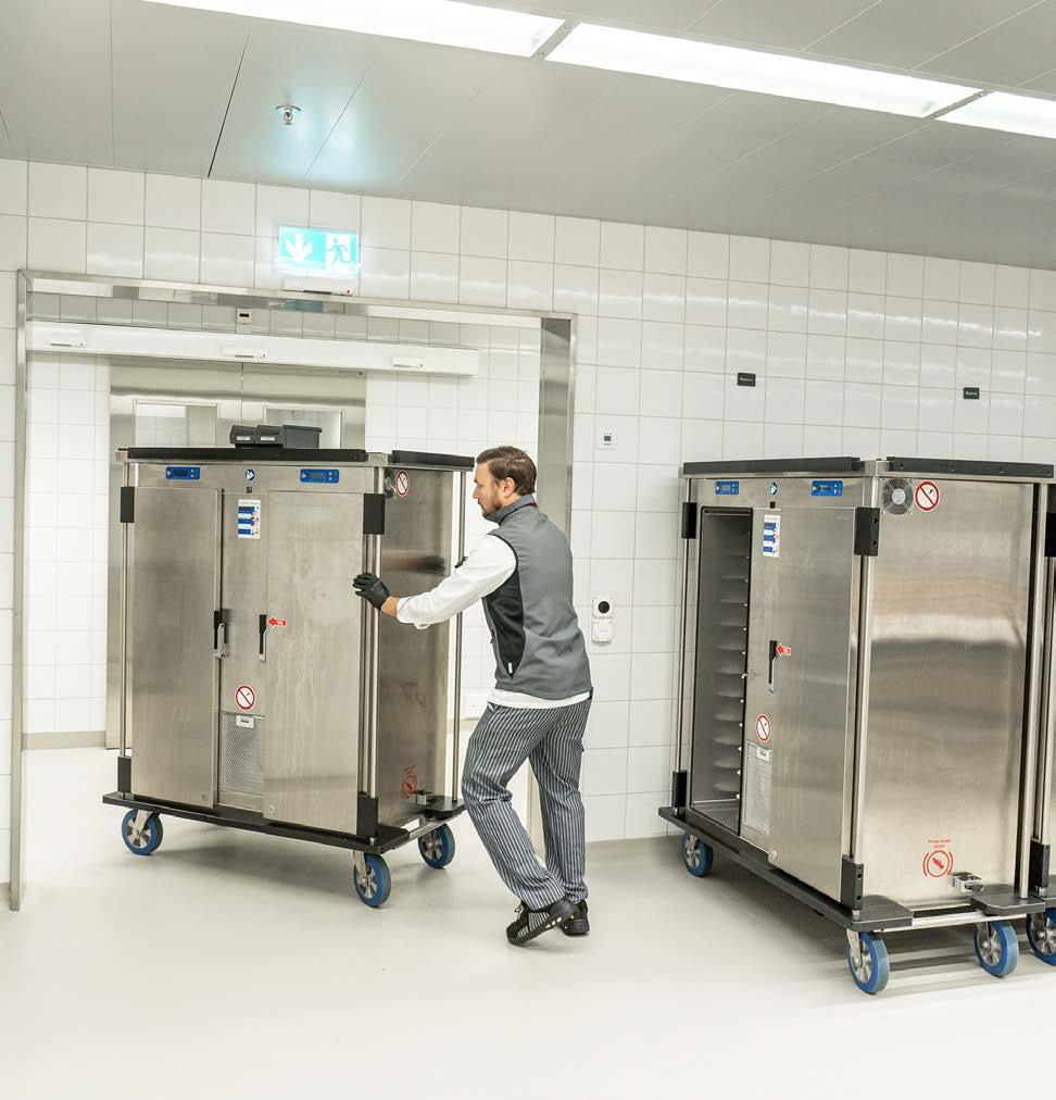 Chaque plateau contient une carte de patient avec des informations sur les allergies, les régimes et la taille des portions. Les assiettes sont ensuite recouvertes d’une clochette ThermoTop, puis introduites dans les chariots de distribution de repas de la société Schmalz, qui sont programmés avec précision de manière à ce que les plats chauds et froids soient parfaitement à la température requise au moment où ils sont servis. Après 35 minutes, le repas est prêt et peut être maintenu au chaud ou au froid pendant une longue période.