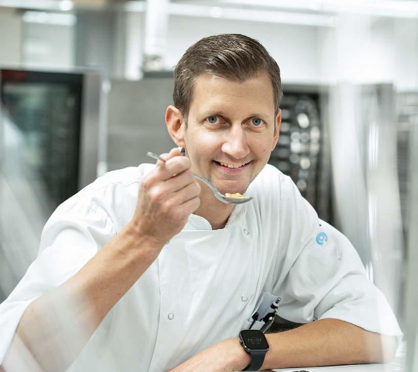 semble bien pensé et orienté vers les jeunes patients – et cela vaut également pour la gastronomie. Au cœur de l’hôpital pour enfants se trouve une cuisine qui mise sur la fraîcheur et l’esprit d’équipe. Curdin Baggio, chef de cuisine à l’hôpital pédiatrique de Zurich, dirige une équipe d’environ 50 cuisiniers et aides-cuisiniers, dont deux apprentis. Depuis près de cinq ans, il marque la cuisine de l’hôpital de son empreinte avec une attitude qui allie artisanat et cœur. «L’administration prend beaucoup de temps, mais il est important pour moi d’être le plus souvent possible avec mon équipe en cuisine», dit-il. «Nous goûtons ensemble, nous discutons, nous ajustons.» Curdin Baggio et son équipe accordent beaucoup d’importance aux produits régionaux