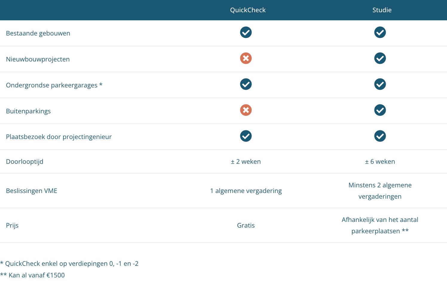 Je las eerder al kort over onze QuickCheck. Bij een QuickCheck gaan we uit van enkele vaste regels, waarbij we steeds een optimale laadtijd voor de bewoners vooropstellen. Hiervoor komt een ingenieur ter plaatse langs voor een check-up van de garage en elektrische installatie. Je ontvangt een offerte met een vaste prijs per parkeerplaats, inclusief een toolbox met informatie voor de bewoners. Geen verrassingen, geen extra kosten voor de VME. Zo heeft iedereen alle informatie die nodig is om geïnformeerd en efficiënt te beslissen tijdens de algemene vergadering.