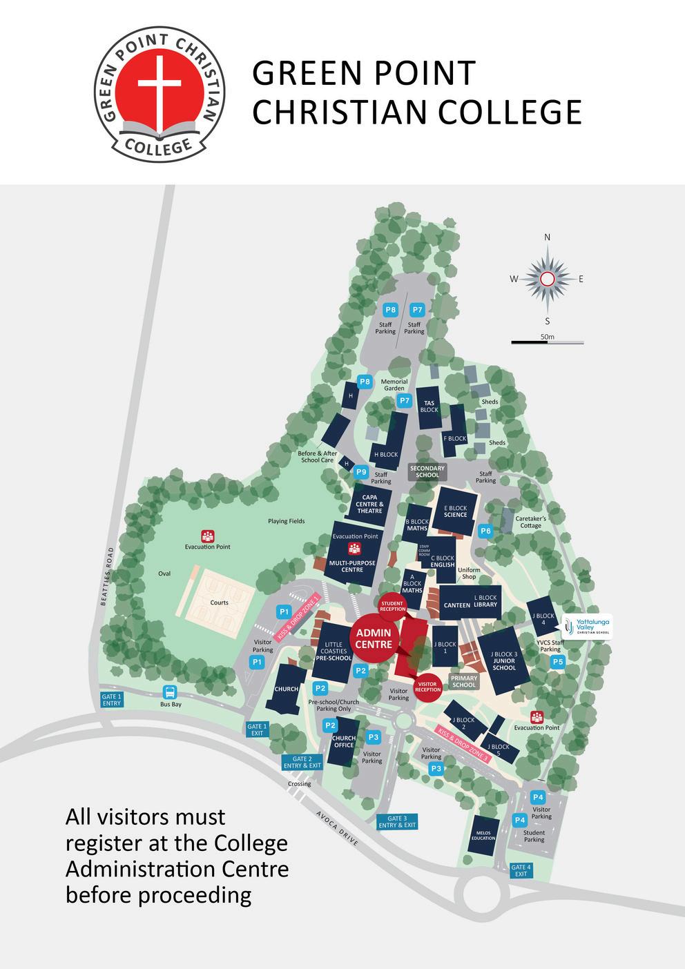 The College has three entrances and four exits. The entrances and exits are numbered so that they correlate with the carpark numbers and the Kiss and Drop numbers. Eg. Gate 1 Entry relates to P1 and Kiss and Drop 1.