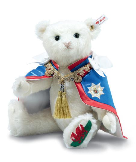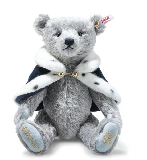 This handsome Steiff bear is a celebration of an imperial Prince enhanced in his regal robes, his navy blue Order of the Garter mantle, worn at the request of the King and Queen for the historic occasion of the coronation. A further enrichment is the Welsh flag embroidered on his paw pad.