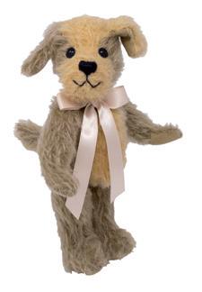 Jointed head White/red ear tag, gold plated ‘Button in Ear’.Body made of brown mohair Hand stitched nose, mouth and claws Eyes and eyebrows embroidered She wears a blue felt neckband with gold hanger
