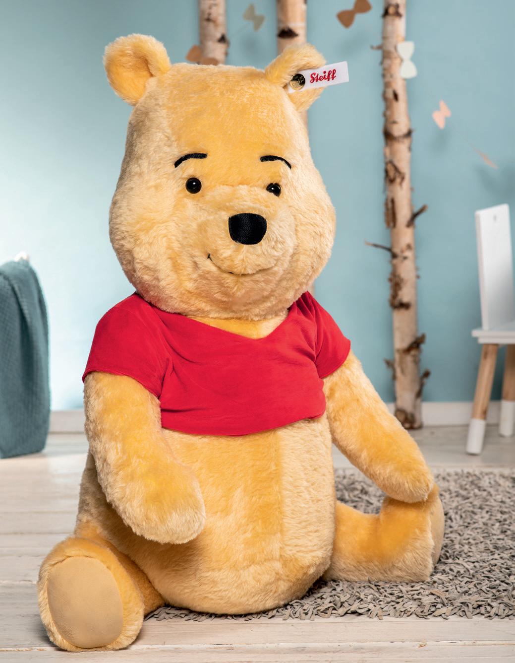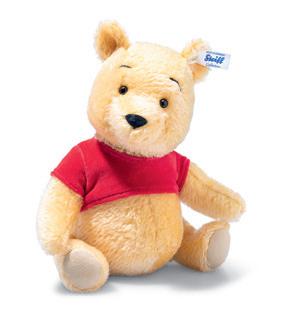 In the early 1960s, Walt Disney was able to acquire the rights to A.A. Milne’s Winnie the Pooh character. Because Walt fondly recalled reading the Pooh stories to his daughters, he was pleased to bring the character into the Disney fold. Under his supervision, Pooh’s design was “modernized” for his first screen appearance in “Winnie the Pooh and the Honey Tree”, a 1966 theatrical short subject. Pooh’s new “look” in this film would become the definitive version of the character for a new generation of fans – those born from the 1960s through today. The Steiff Winnie The Pooh is made of blond mohair and three way jointed. He wears the trademark red shirt popularized in the Disney films and television programs. This “modern” interpretation of the character beloved by all – no Pooh, Steiff, or Disney collection is complete without it!