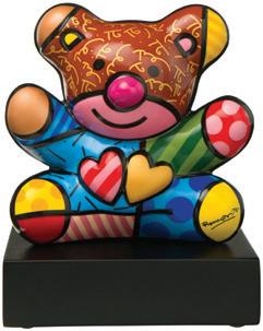 Artist Romero Britto has created a charming teddy figurine, Golden Truly Yours, with wooden base and real gold decor.