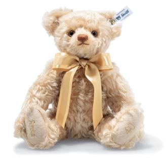 Embroidery up to 2 lines of 10 characters each. ( no symbols or special characters). Discover Steiff’s personalised Teddy bear – the perfect gift for any occasion, be it a birthday, anniversary, or a name day celebration. With a charming bow available in pink, blue, or gold, and the option to have the foot soles embroidered in matching colours, this bear becomes a truly personal companion. Made from the finest mohair. 5 way jointed.