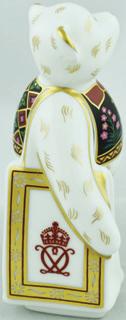 This highly collectable Steiff bear is a celebration of a noble Princess, adorned in her regal robes, worn on the occasion of the coronation, at the monarch’s request. Her fine white mohair emulates the Princess’s ivory silk crepe gown she wore underneath her formal mantles. A further tribute is the Welsh flag embroidered on her paw pad.