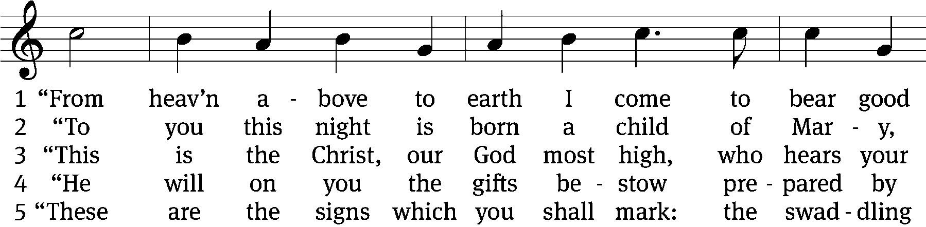 It is believed that this 15-stanza hymn of Martin Luther was written for his familyās Christmas Eve entertainment. These ļ¬rst ļ¬ve stanzas would have been sung in Lutherās home by a man dressed as an angel.