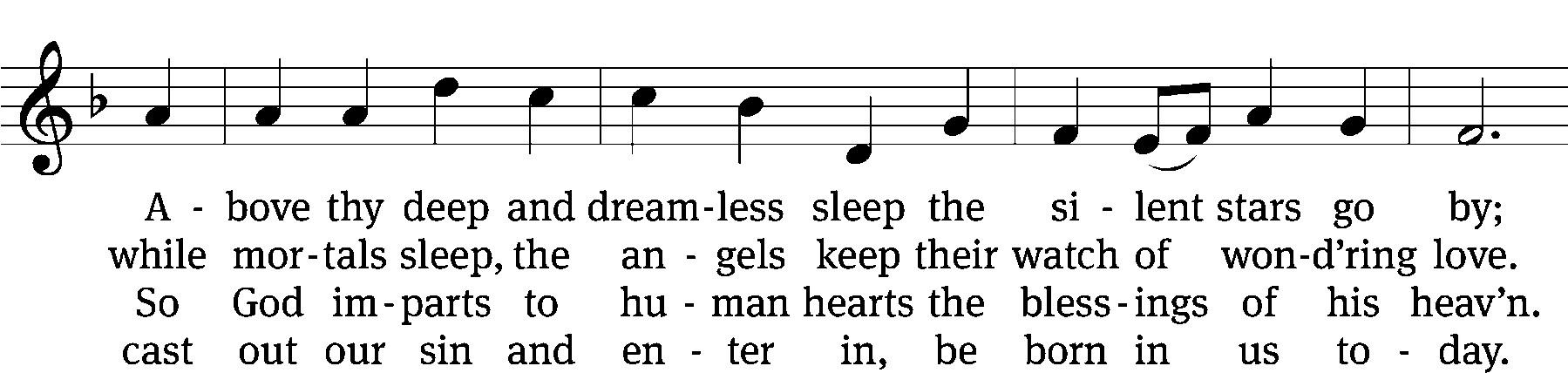Still, still, still, let all the earth be still. For all is hushed, the world is sleeping, holy star its vigil keeping. Still, still, still. My heart with joy is ļ¬lled.