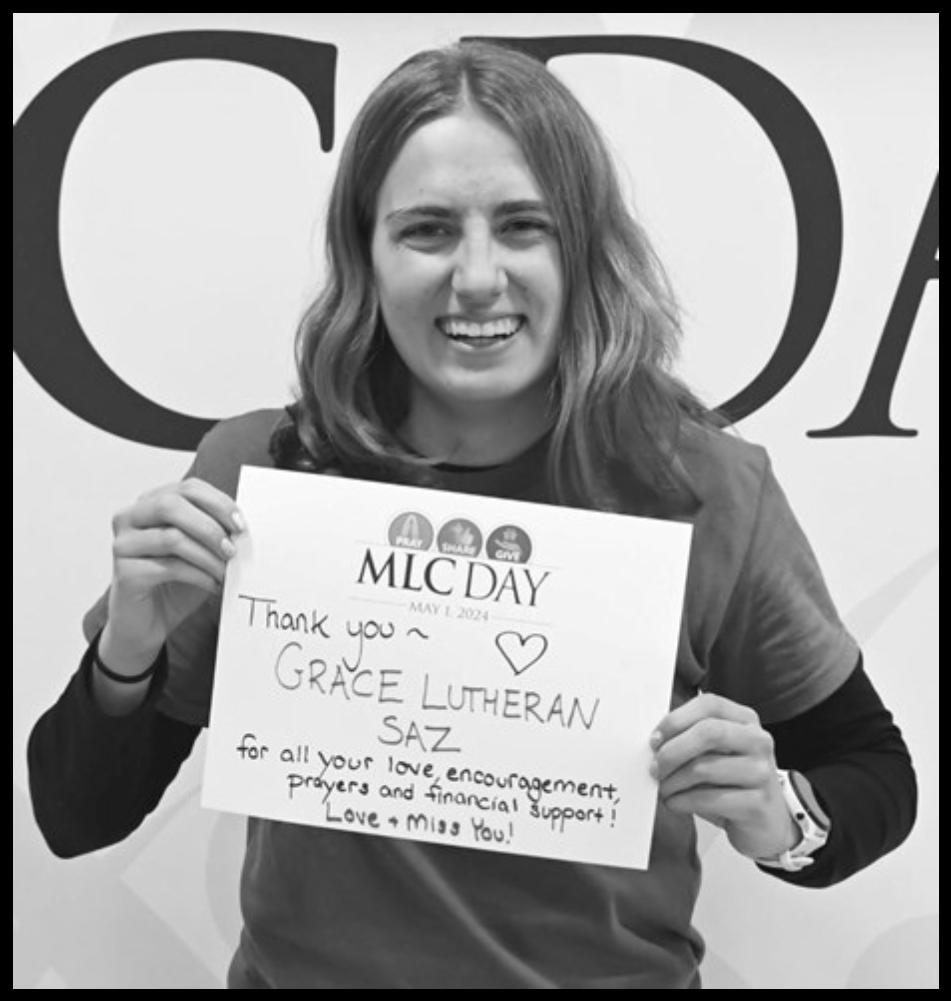 Grace-Tucson member Naomi Kassulke is a student at Martin Luther College (MLC) in New Ulm, MN. She sent a “Message Home” to thank our congregation for our support through the Congregational Partner Grant Program (CPGP). Her sign says “Thank you Grace Lutheran SAZ for all your love, encouragement, prayers, and financial support! Love & Miss You!” MLC Day celebrates and promotes ministerial education. Celebrate with MLC by praying for the students and consider donating to Grace’s “Called Workers Scholarship Fund” which provides a scholarship to active Grace members at MLC. This amount is matched through the CPGP program. We pray for God’s blessings on Naomi and she finishes her first year at MLC.