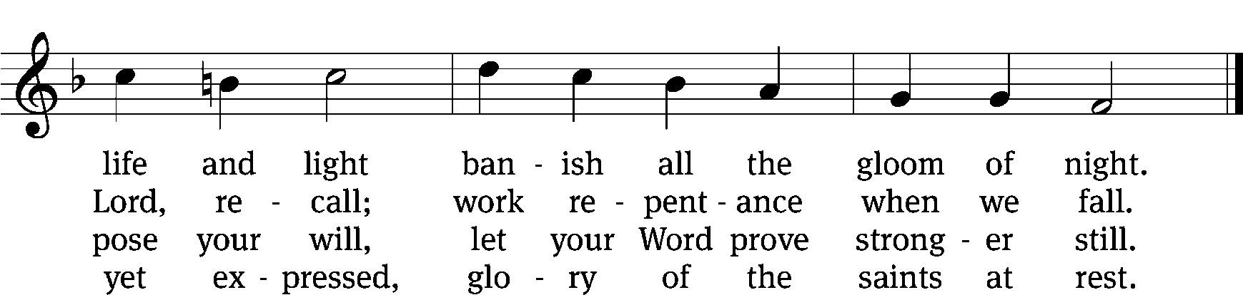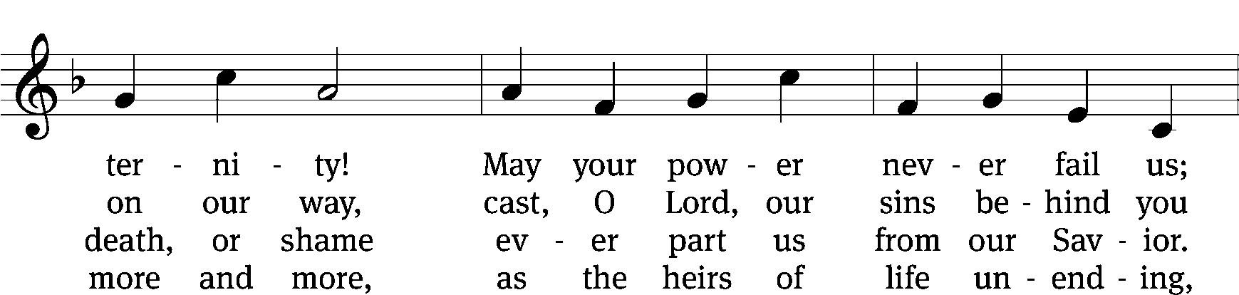 Our Father in heaven, hallowed be your name, your kingdom come, your will be done on earth as in heaven. Give us today our daily bread. Forgive us our sins, as we forgive those who sin against us. Lead us not into temptation, but deliver us from evil. For the kingdom, the power, and the glory are yours now and forever. Amen.