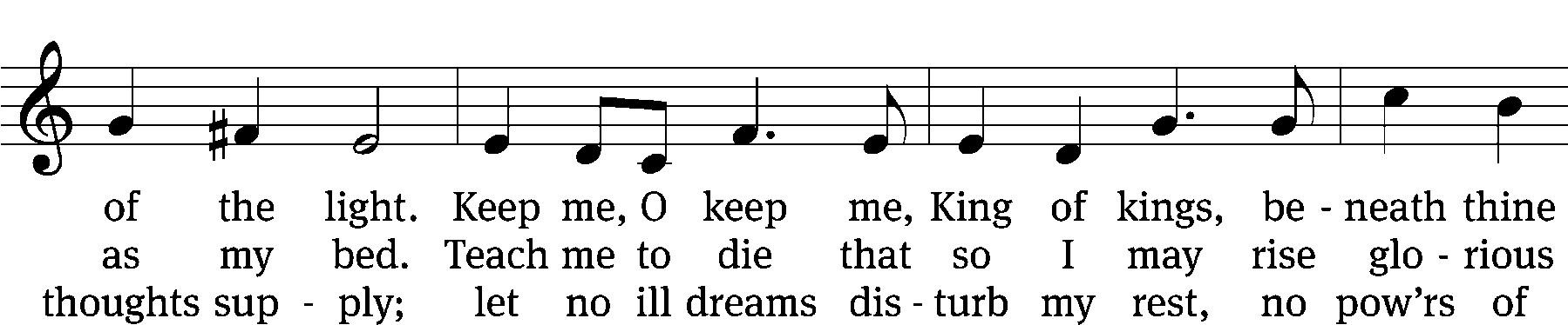 Our Father in heaven, hallowed be your name, your kingdom come, your will be done on earth as in heaven. Give us today our daily bread. Forgive us our sins, as we forgive those who sin against us. Lead us not into temptation, but deliver us from evil. For the kingdom, the power, and the glory are yours now and forever. Amen.