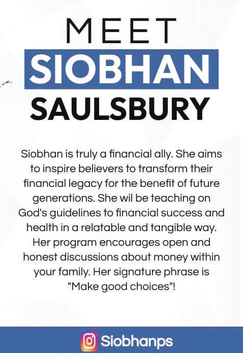 Siobhan Saulsbury is a financial ally. She inspires believers to transform their financial legacy for the benefit of future generations. She teaches on God's guidelines to financial success and health in a relatable and tangible way. Her signature phrase is "Make Good Choices"!