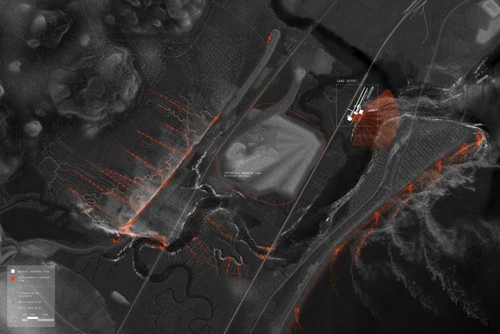 A Two-Speed Landscape balances prolonging with a sense of urgency. Humans operate at the scale of geologic agents. This change takes place at a faster pace than it does through natural processes. The project investigates the idea of this “two-speed” landscape, where sediment is anthropogenically displaced at a much quicker rate than it’s being naturally replenished.