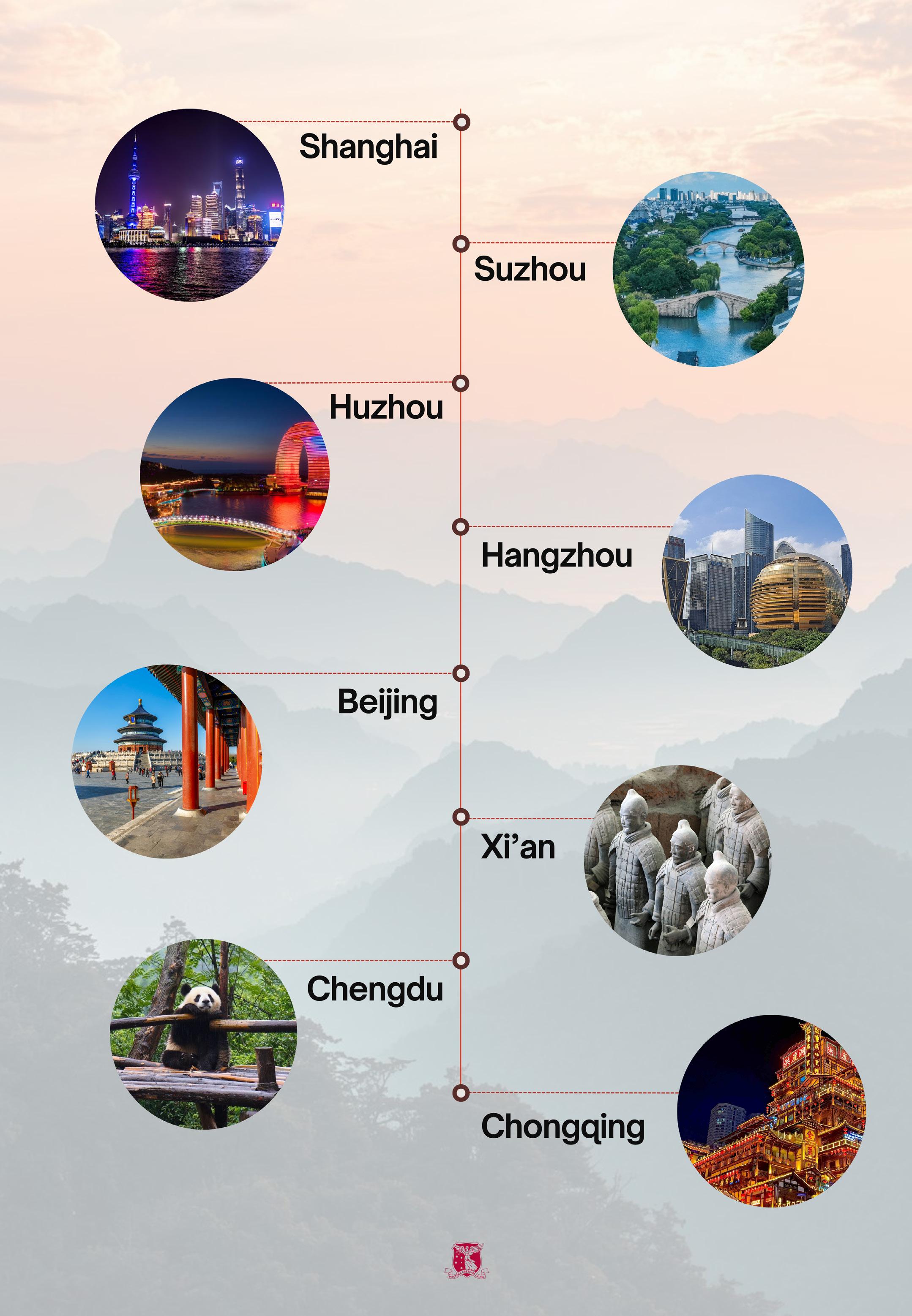 This immersive 15-day journey across eight cities offers a unique oportunity to explore China’s millenarian heritage and its stateof-the-art modern cities. The adventure begins in Shanghai, where members will explore the serene Yuyuan Garden, the historic Jade Buddha Temple, and the iconic skyline views of The Bund. From there, the route follows the historic Grand Canal through the ancient water towns of Suzhou and the tranquil West Lake of Hangzhou.
