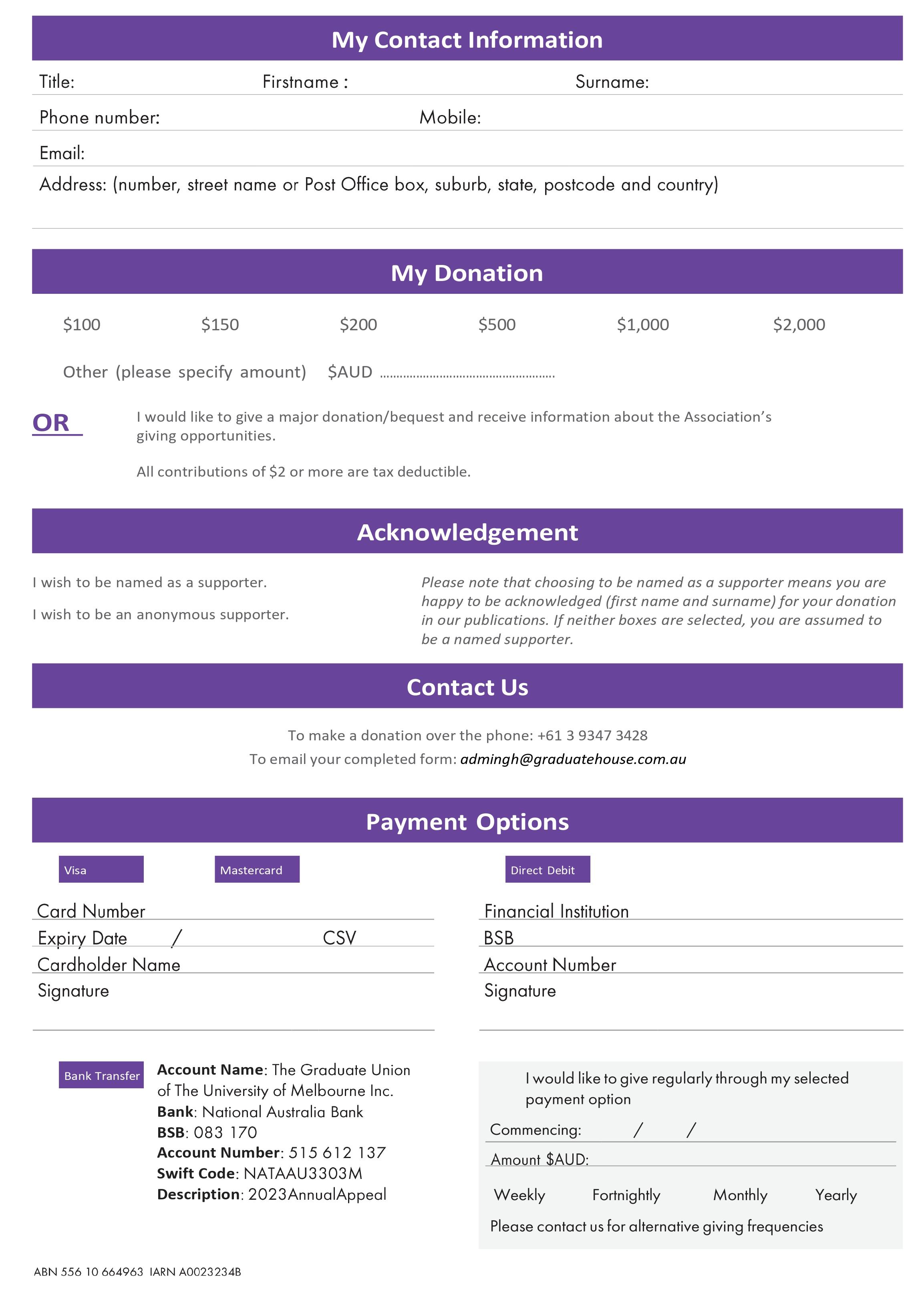 The completed Nomination Form and other forms provided in the Election Kit should be lodged by post to the Return ing Officer’s address above or by email (signed, scanned and as an attachment) to sluntz@abovequota.com.au or placed in the ballot box at the offices of The Graduate Union.