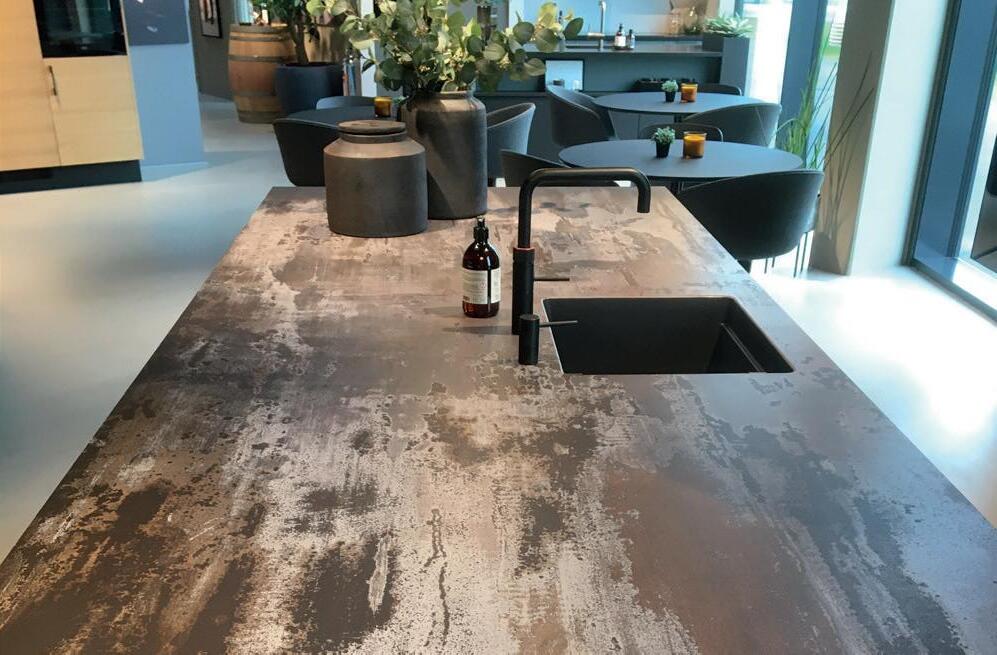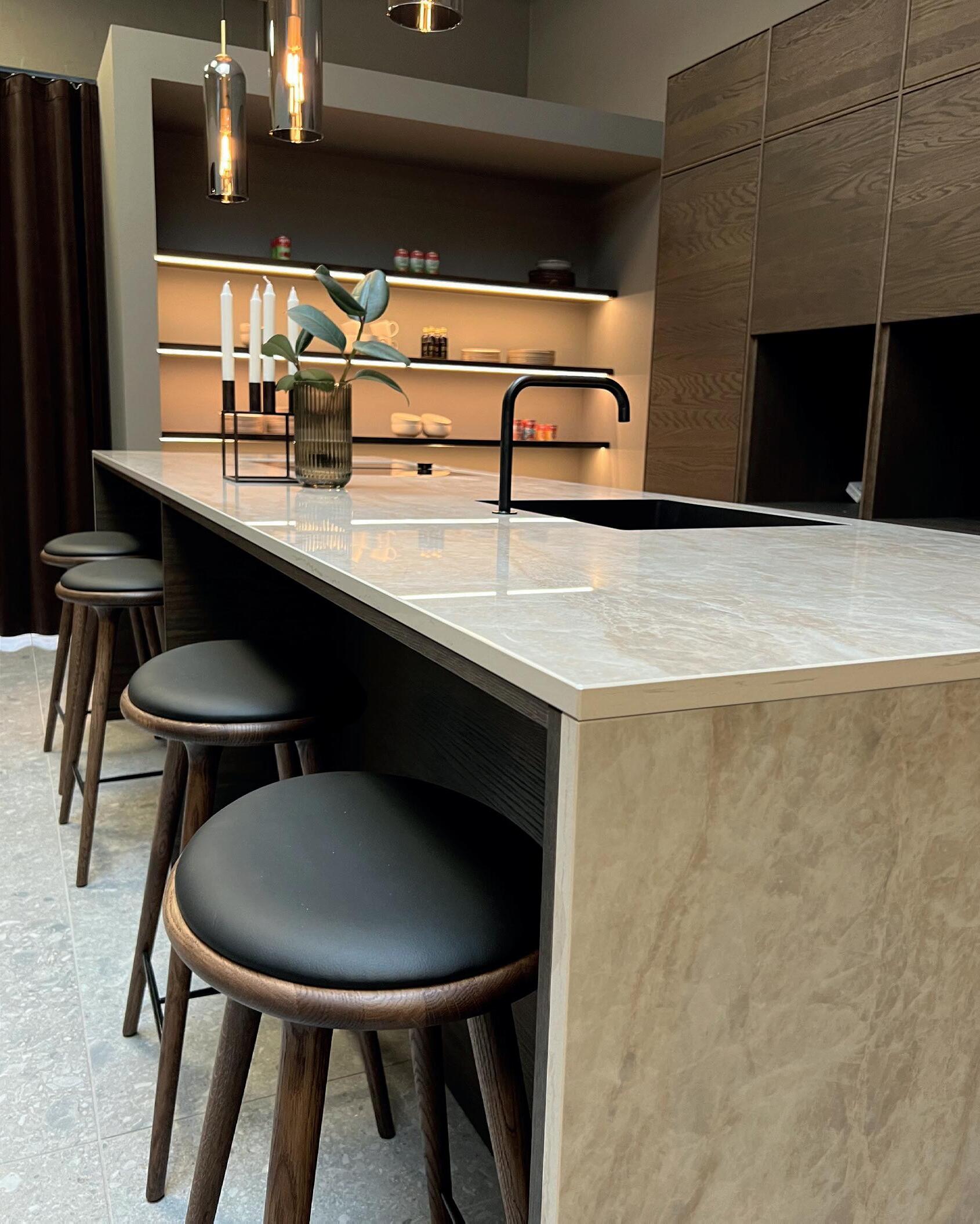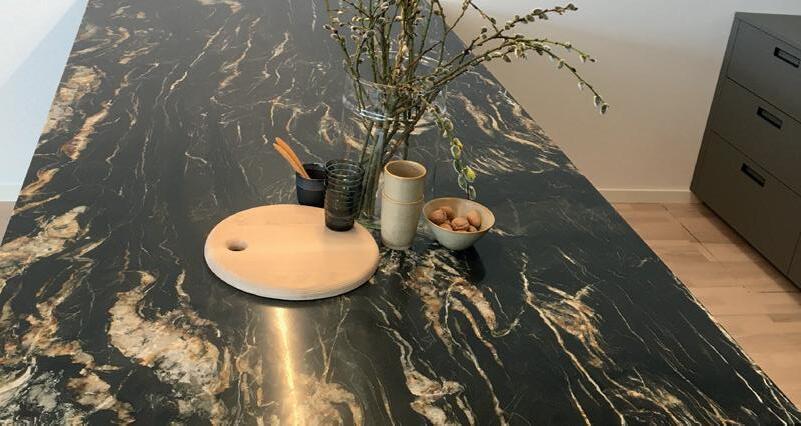 Når du står med vores prøver i butikken (15 x 30 cm), er de skåret ud fra vores råplader på ca. 320 x 160 cm. Så det er kun et glimt af, hvordan hele din bordplade kan komme til at se ud.