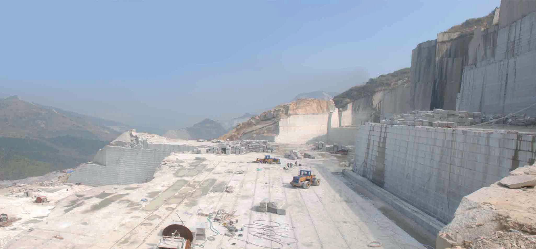 Natursten brydes i store blokke, der efterfølgende saves op til råplader med en tykkelse på enten 20 mm eller 30 mm.
