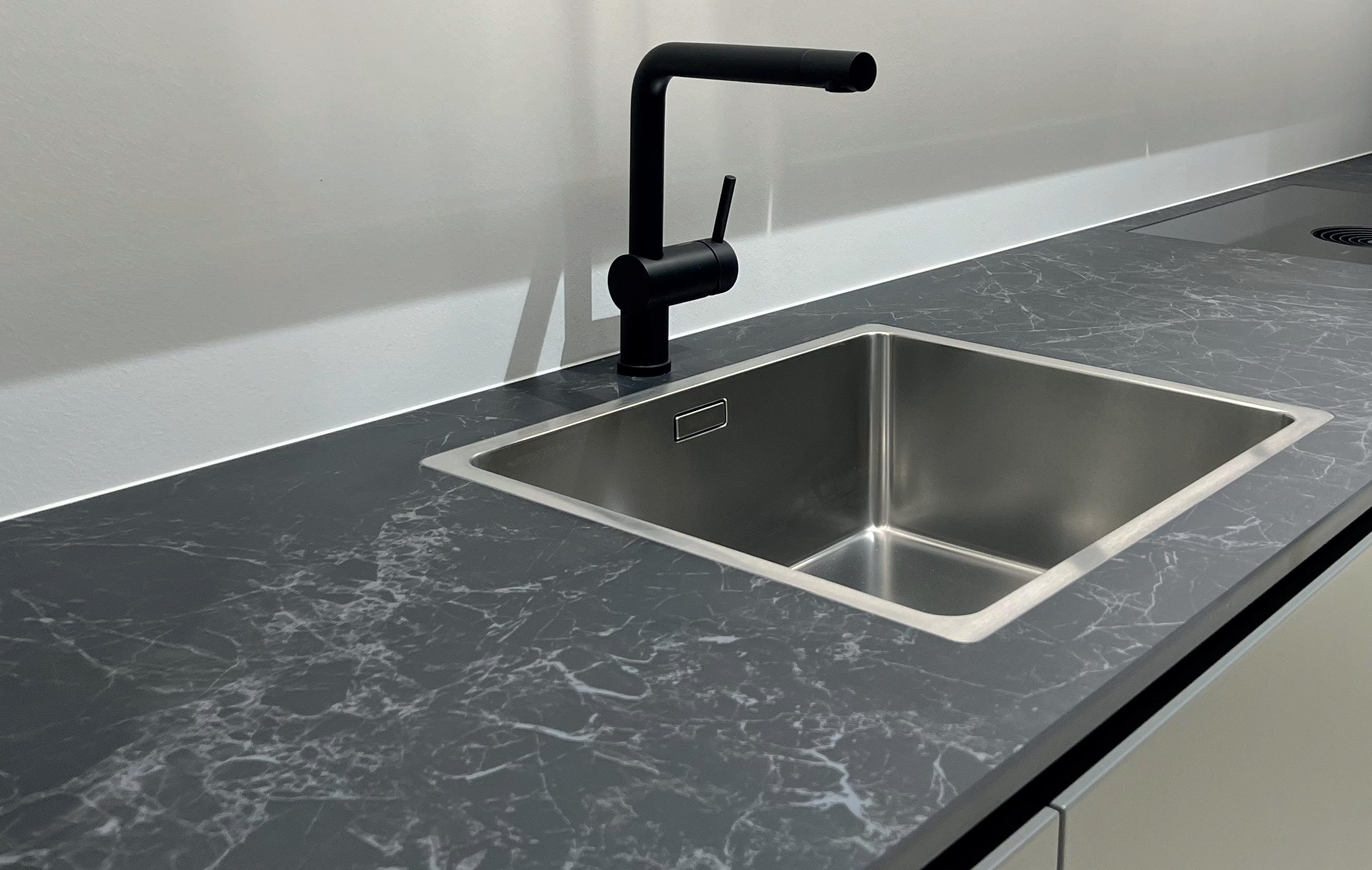 Vaskehullet er fræst ned i bordpladen så oversiden på vasken ligger plan med bordpladen.