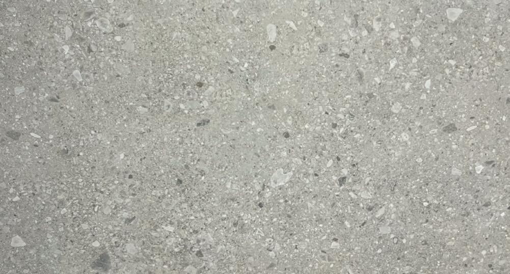 Grå grundfarve med varieret grå beton struktur samt sorte, grå og røde nister.