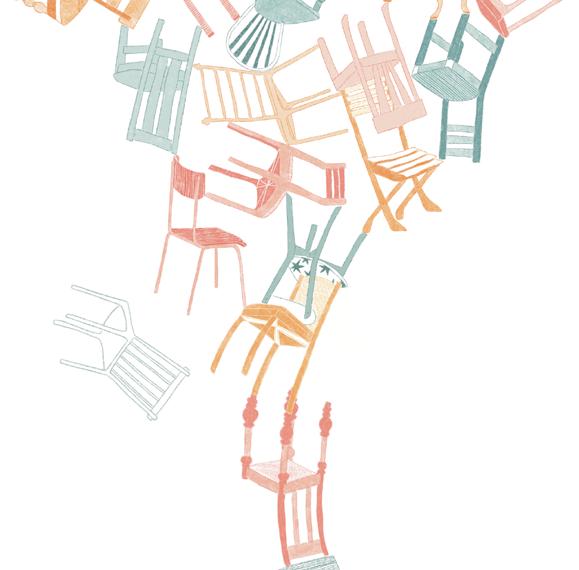 Chairs of all shapes and sizes stack high above, impossibly teetering on the edge, frozen here before they inevitably fall. As textures and line merge into a jenga, a sculpture is created, highlighting an object we each use daily.