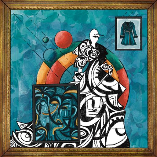 This piece explores the worlds of both fashion and art and how they have complemented each other in a harmonious dance throughout history. The curator figure pulls inspiration from both the cubist inspired painting and the garment to create a new piece that expands on the edge of creative possibility.